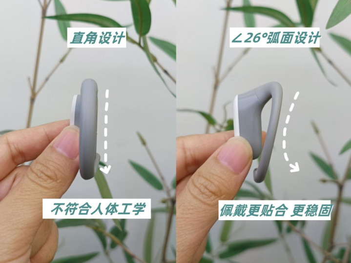 这款耳机采用轻量化设计,单耳仅有6.8g,同时采用了亲肤的硅胶材质,佩戴起来舒适不痛耳,与此同时,你拿到手中会发现它的侧面是有些弧度的,这是因为虹觅Olite以采集1000+亚洲人耳数据为模型,打造了更加贴合耳部的26°工学弧面,使得我们佩戴起来更加贴合稳固,这个设计非常少见。